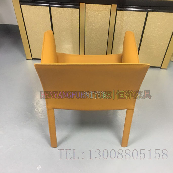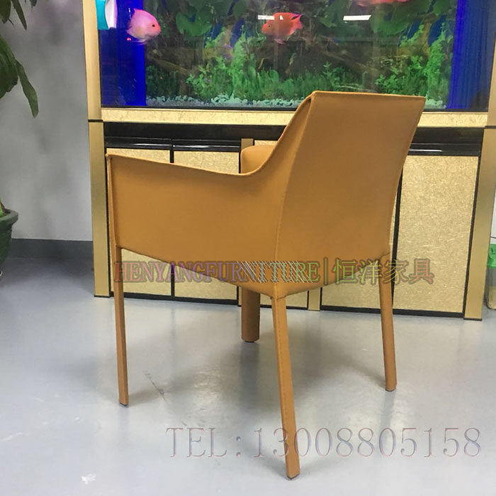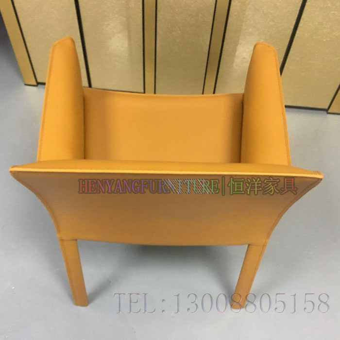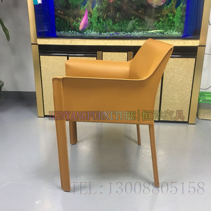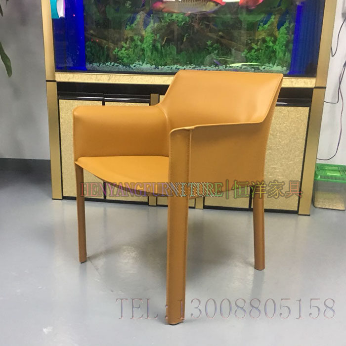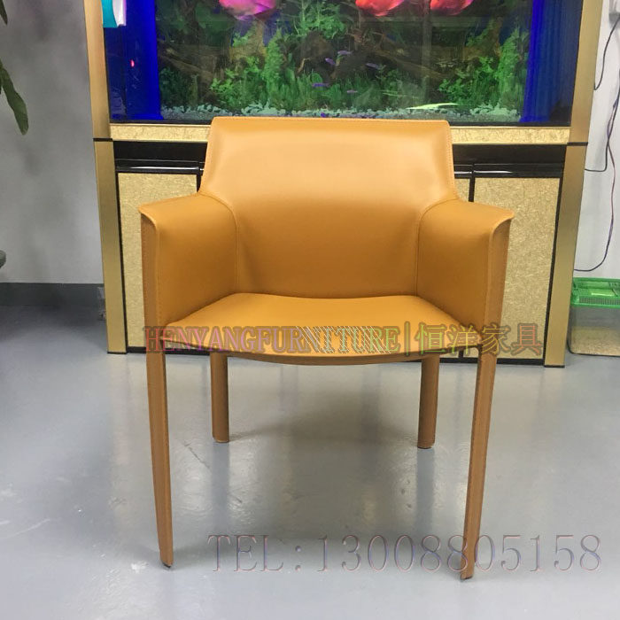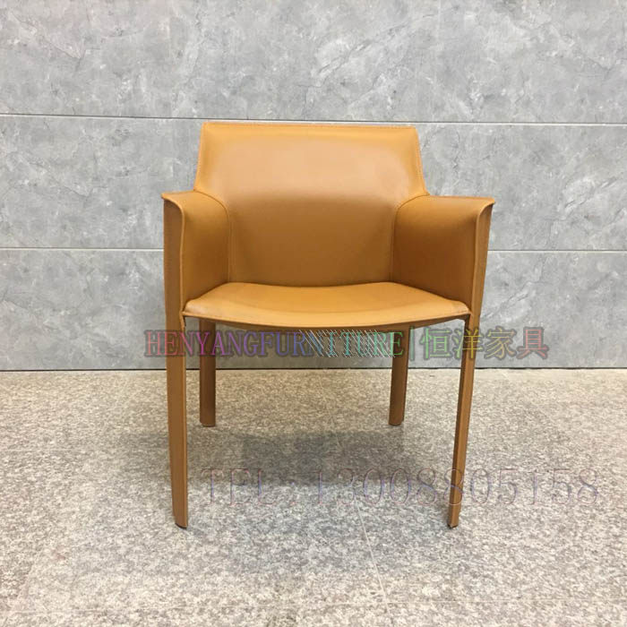 - 设计师马鞍皮休闲扶手椅简约硬皮餐椅售楼处会客接待马鞍皮硬皮椅 产品名称:设计师马鞍皮休闲椅餐椅 产品尺寸: 51*58*82CM 产品材质:复合马鞍皮...